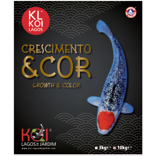 KL – KOI LAGOS ® Crescimento & Cor – o alimento exclusivo Primavera/Verão que promove o crescimento e reforça as cores das Kois a partir dos 15cm, composto por granulado de 5 mm, 100% flutuante cuidadosamente coextrudido.