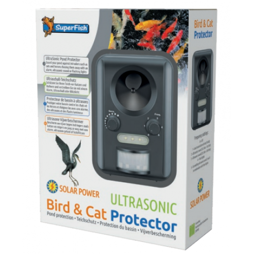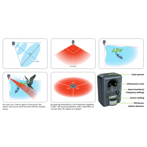 Coloque o Bird & Cat Protector próximo ao seu lago, carregue as baterias e selecione uma frequência de som ultrassónica.